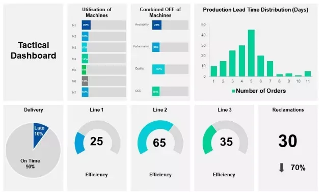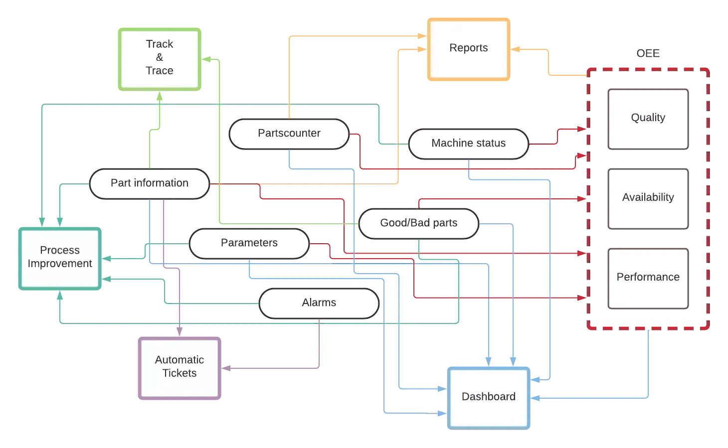 - Dashboards voor OEE, scrapratio, cyclustijden en machinestilstand